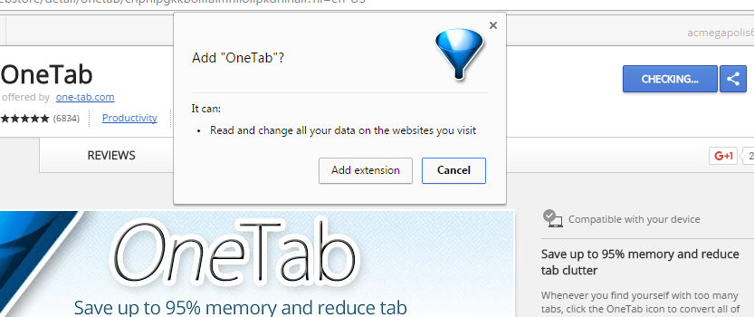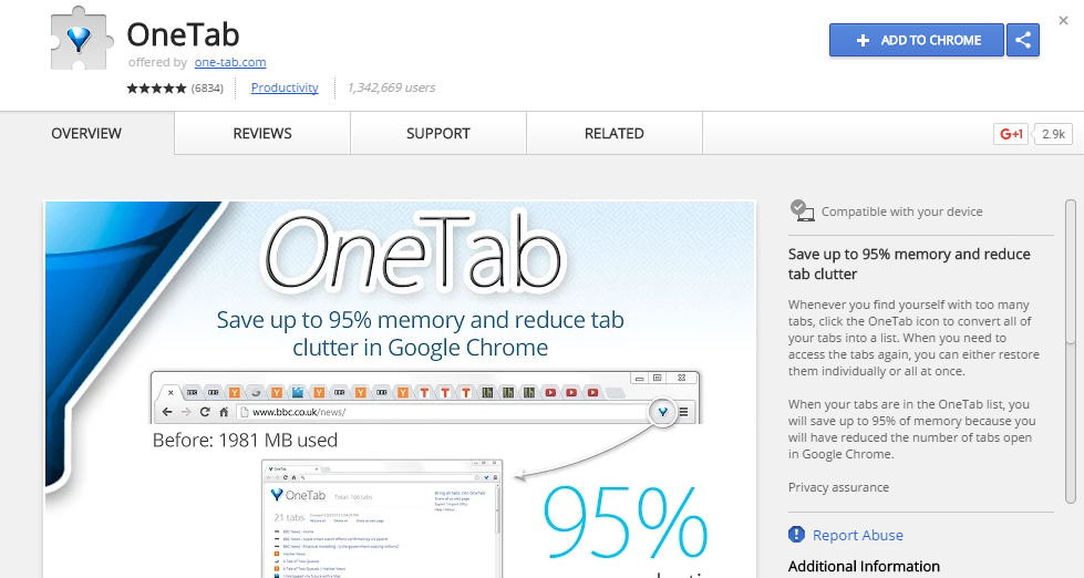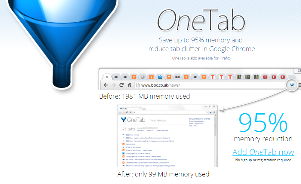 Extension OneTab ជាដំណោះស្រាយដ៏ប្រសើរមួយសម្រាប់អ្នកចូលចិត្តបើក Tab ច្រើននៅពេលប្រើប្រាស់ Browser Chrome និង Firefox ដោយសារវាអាចជួយសន្សំសំចៃ Memory បានដល់ ៩៥% ដើម្បីជួយឲ្យកុំព្យូទ័រដំណើរការលឿន។
